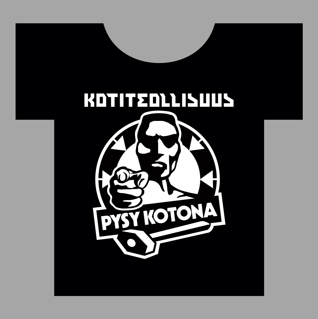 PYSY KOTONA (2020)"Pysy Kotona", translates as "Stay Home". A logo for a Covid-19 infomercial campaign by the Finnish band Kotiteollisuus. The group`s sledgehammer-man mascot makes you an offer that you can`t refuse. Originally designed for publication in the newspapers Etelä-Saimaa and Uutisvuoksi but later also made into a t-shirt and a tote bag.
