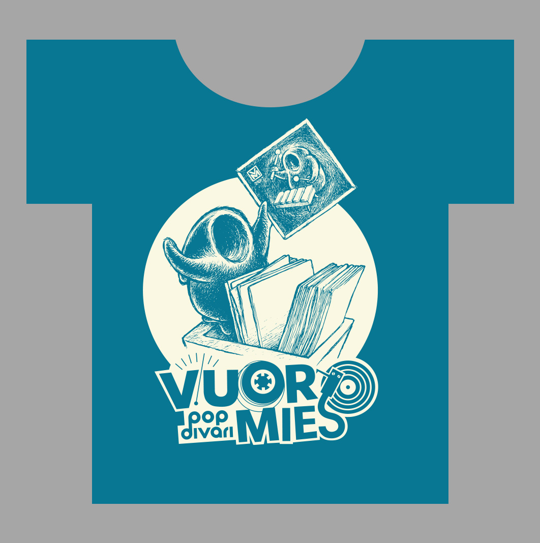 VUOROMIES (2023)T-shirt / bag designed for Popdivari Vuoromies, a reprint with Vuoromies holding a different record than in the first run of shirts. Available in several different colours. www.vuoromies.fi